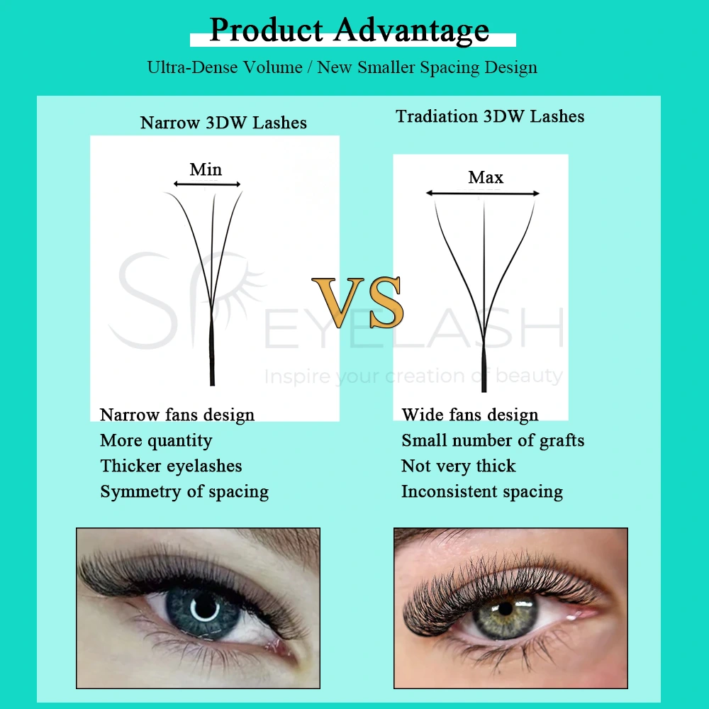 Sammenlignet med tradisjonelle brede W-formede vipper, tar de smale 3dw-vippene et mer kompakt arrangement og utvidet vippebånddesign. Lash-arrangementet med høyere tetthet skaper en dypere, fyldigere vippelinje, og den smalere vifteformen resulterer i en bedre, mer jevn utseende. I mellomtiden danner den mindre fanbasen sammenkoblet med det utvidede vippebåndet et større bindingsområde, og forbedrer vedheft og holdbarhet, og unngår potensiell rot og ujevnhet av bred-fiske W-formede vipper.